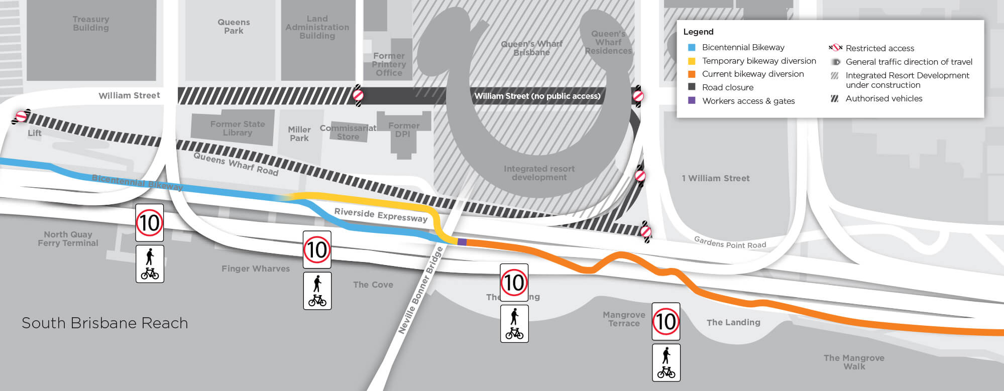 From 8pm Tuesday 16 July 2024, a temporary realignment of the diversion for all bikeway users along the Bicentennial Bikeway will be implemented while works to upgrade the public space within the Queen’s Wharf development continues