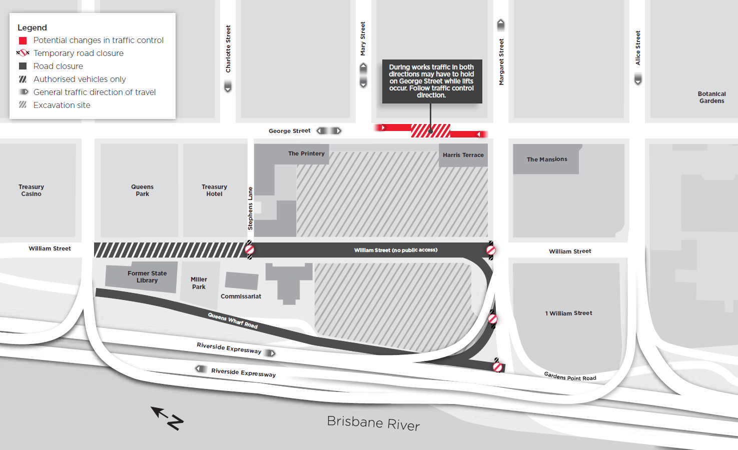 From Monday 26 August 2019 materials will be lifted from trucks on George Street into the Queen’s Wharf construction site. For safety reasons, temporary traffic holds will be required on George Street.