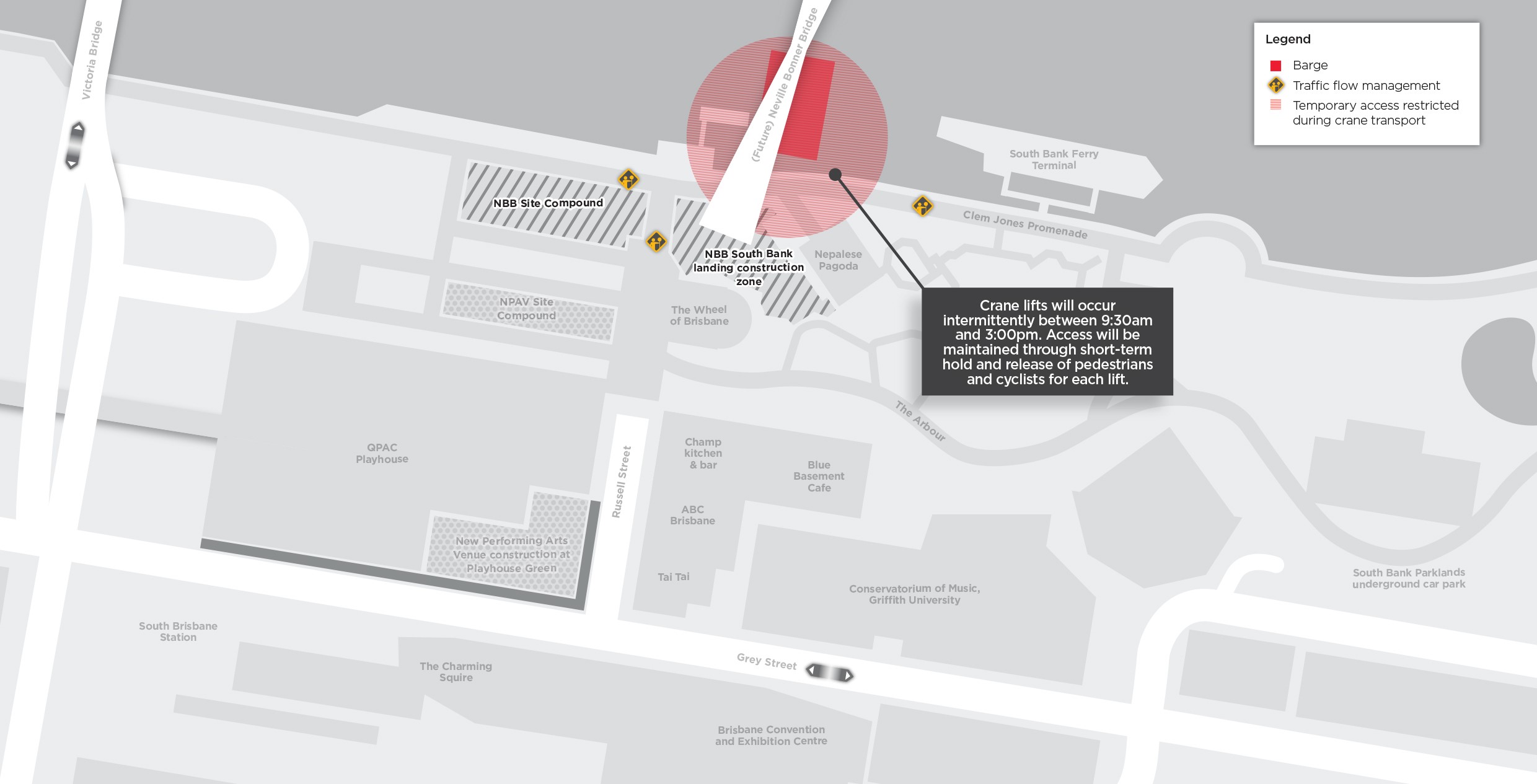 Traffic controllers will be in position at Russell Street, and on the Clem Jones Promenade between Southbank 1 and 2 Ferry Terminals to assist pedestrians and cyclists at times when lifts are occurring. Temporary holds may be required for short periods of time (up to 5 minutes) while the lifts are occurring. Outside the crane lifts, normal traffic movements will continue through the area. See map for more details.