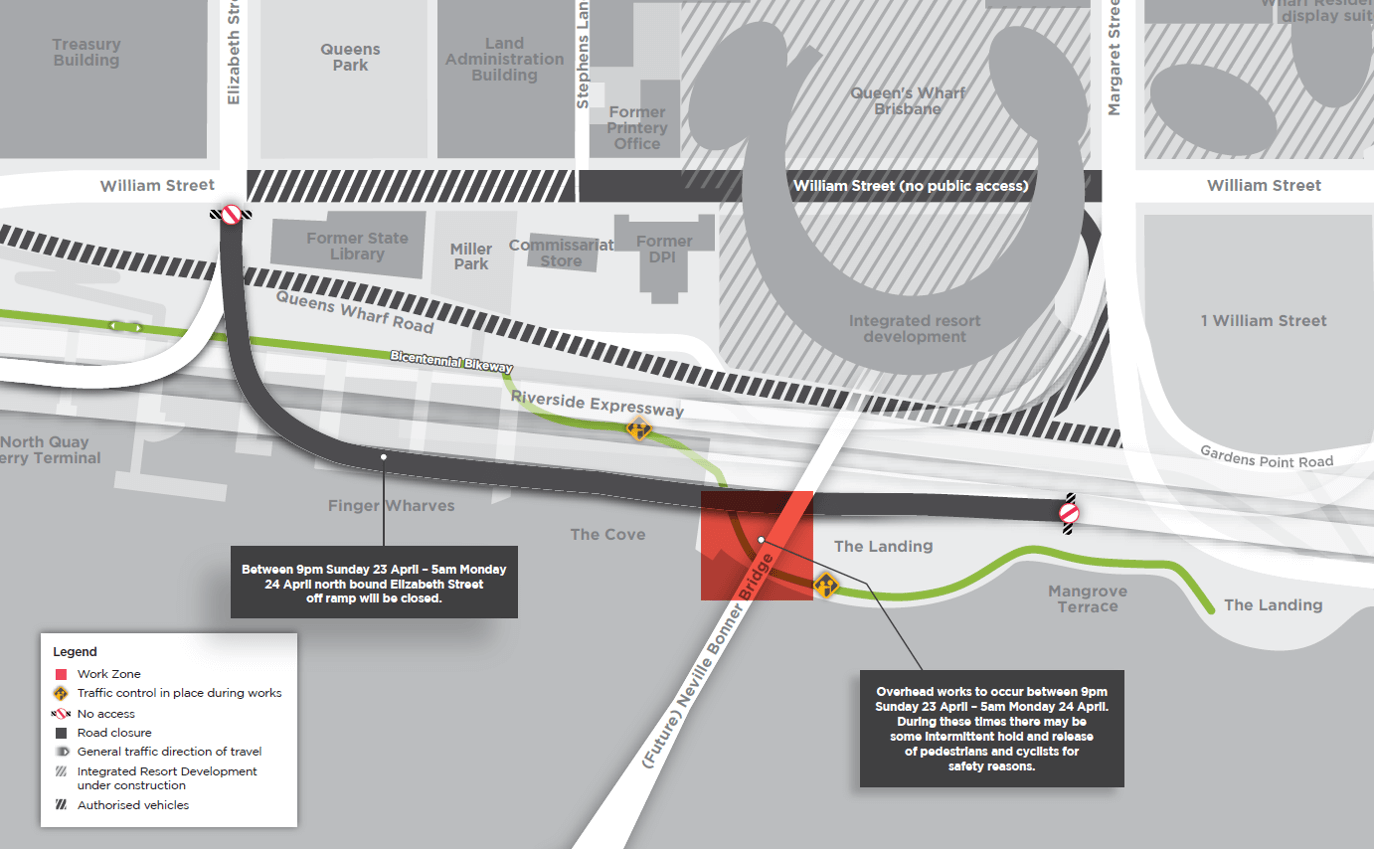Night work: On Sunday 23 April 2023, between 9pm and 5am. Bridge contractor Fitzgerald Constructions will be working out of hours to install the Neville Bonner Bridge safety screens that sit above the Bicentennial Bikeway adjacent to the Elizabeth Street off ramp.