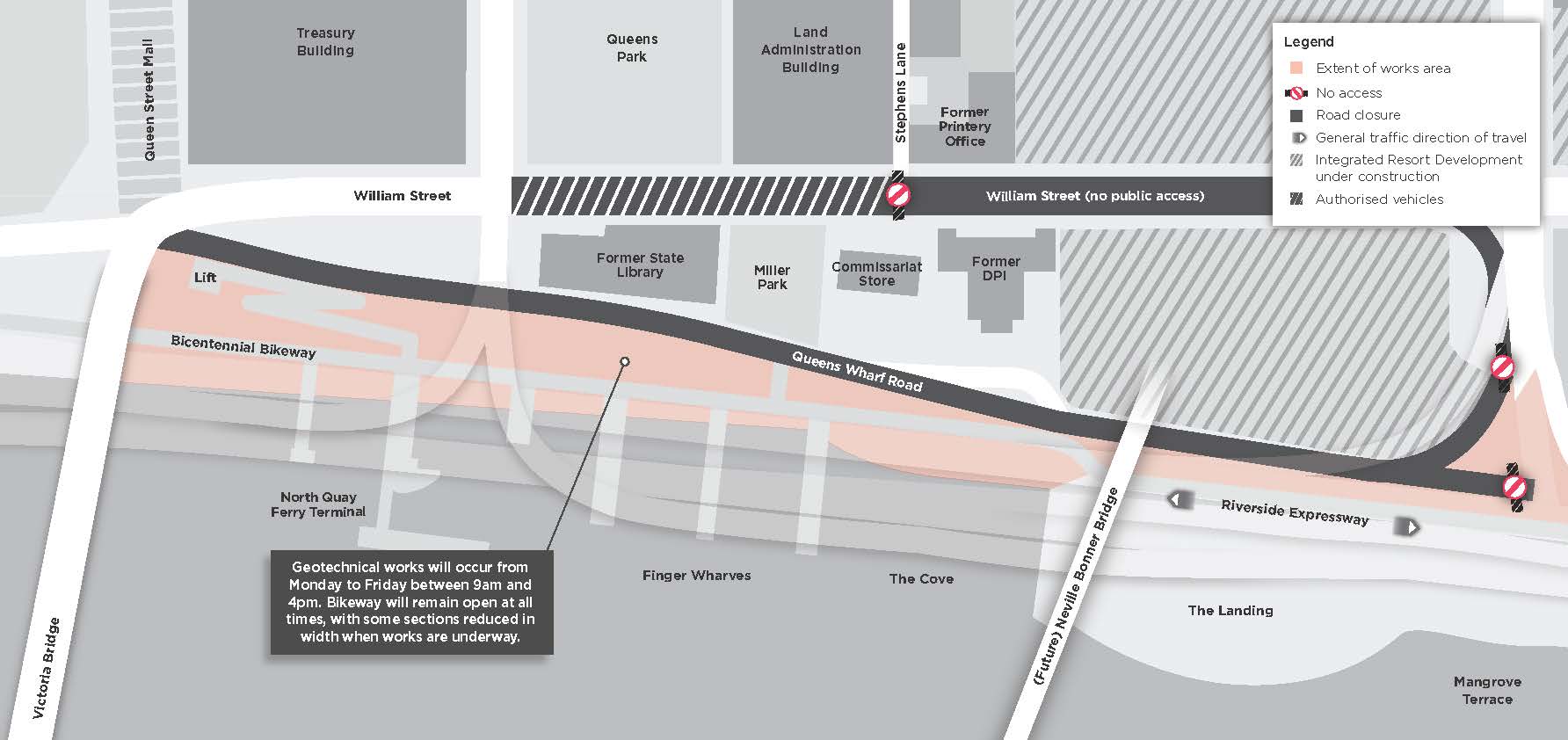 Early works to investigate ground conditions are in sections adjacent to the Bicentennial Bikeway, which may require some temporary reductions in width, however bikeway access will be maintained at all times.