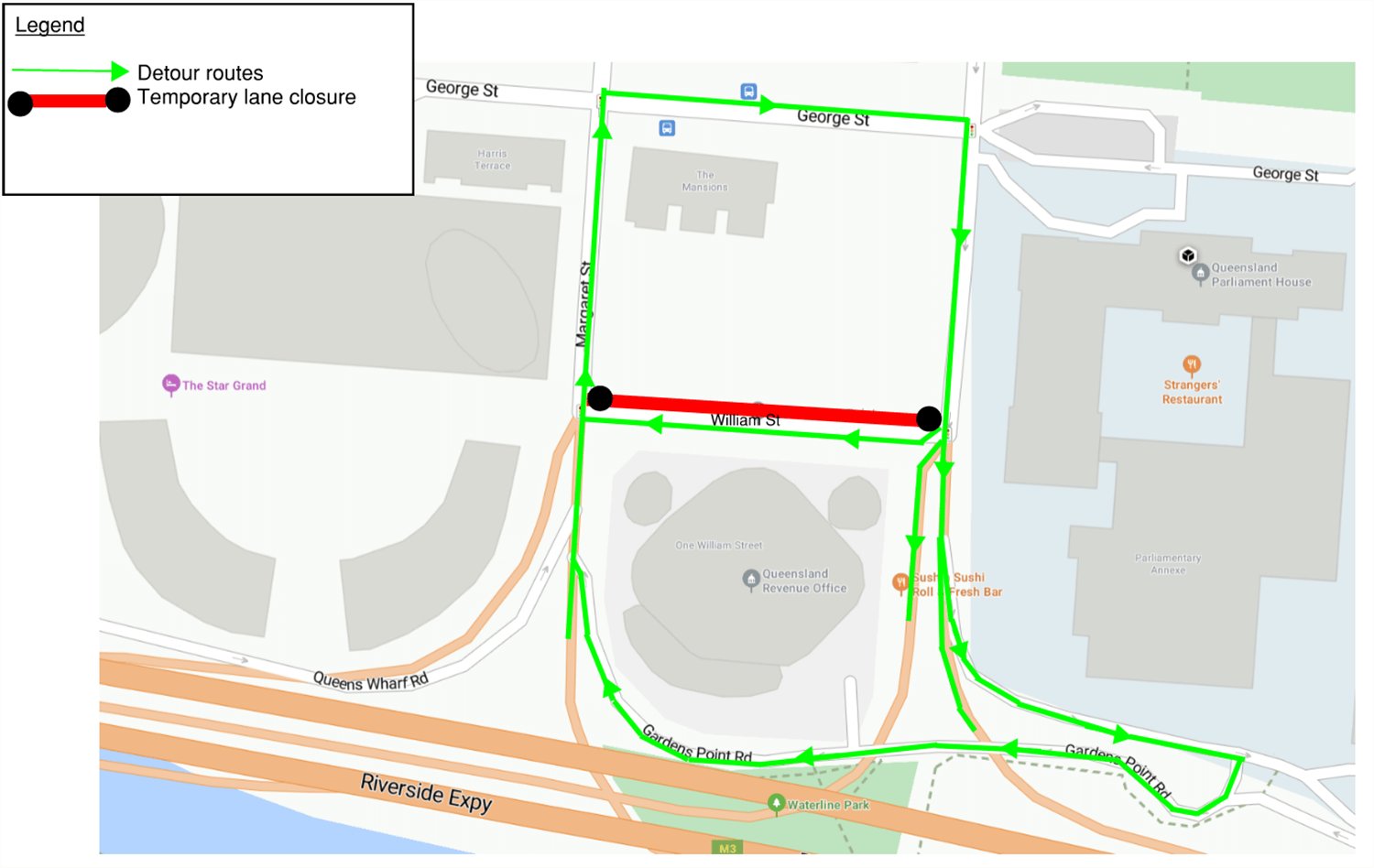 On selected days a temporary traffic detour will be required for works on William Street for Southeast bound traffic directions between Margaret Street and Alice Street.