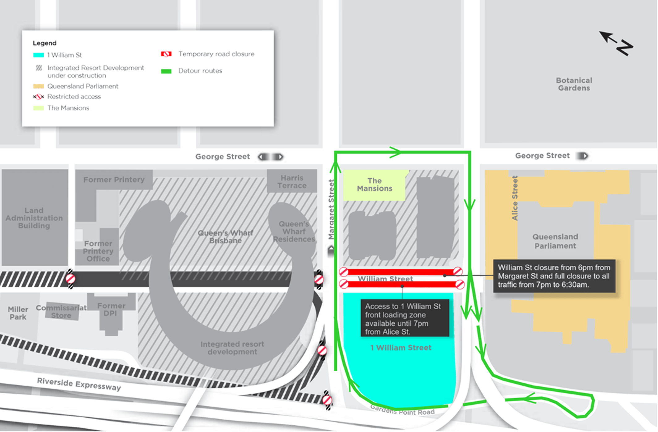 Access to 1 William St front loading zone will be available until 7pm from Alice St.