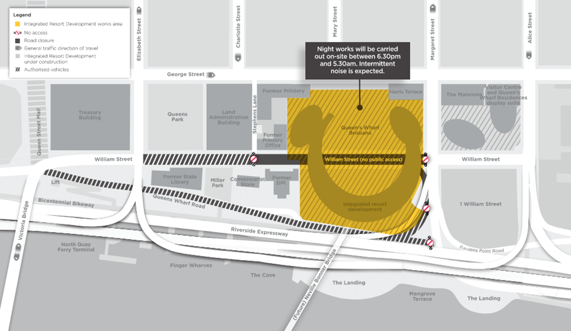 Night works will be within the Integrated Resort Development site. William Street and Queen’s Wharf Road will be used as loading zones (see map).