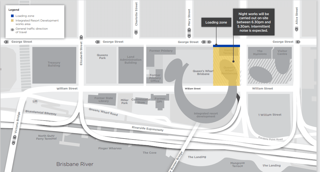 Night works will be within the Queen’s Wharf Residential Tower site. George Street will be used as loading zone.