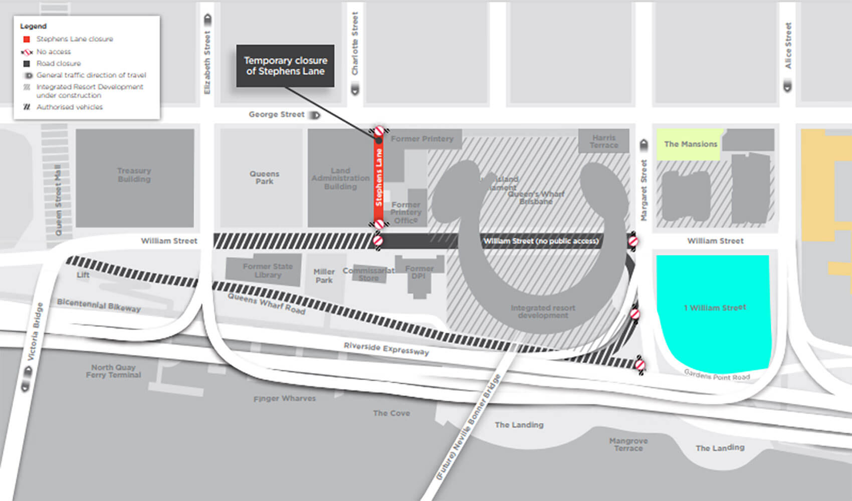 The entrance and exit of Stephens Lane will be closed to public access. Construction and delivery vehicles will access part of the lane under traffic control from time to time. The lane will reopen to public access as a shared zone.