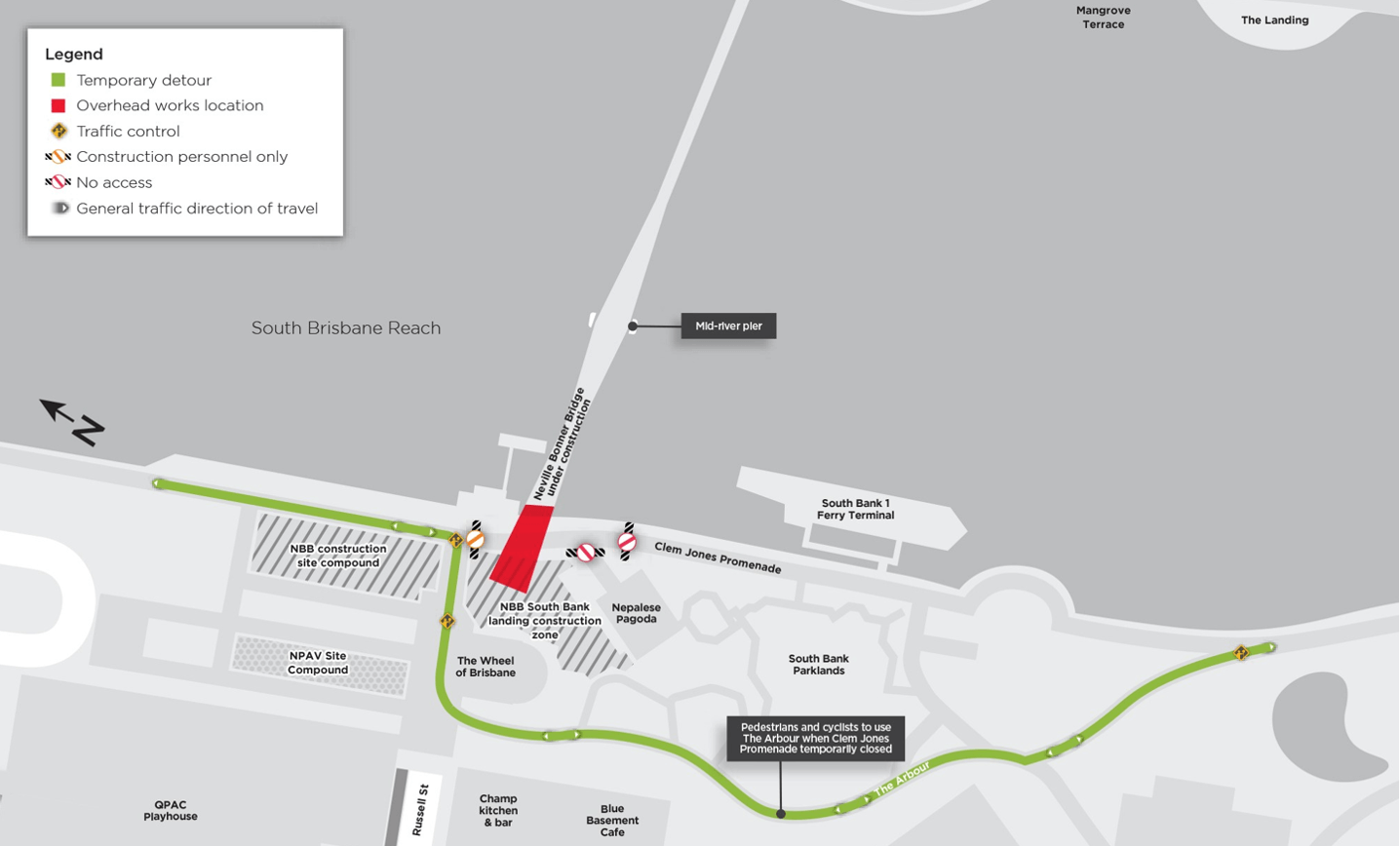 A Clem Jones Promenade temporary detour will be in place between the Clem Jones Russell Street Ramp and Riverside Green. Traffic controllers will be on-site to guide pedestrians and cyclists along the temporary detour. Cyclists will need to dismount and follow the detour route.