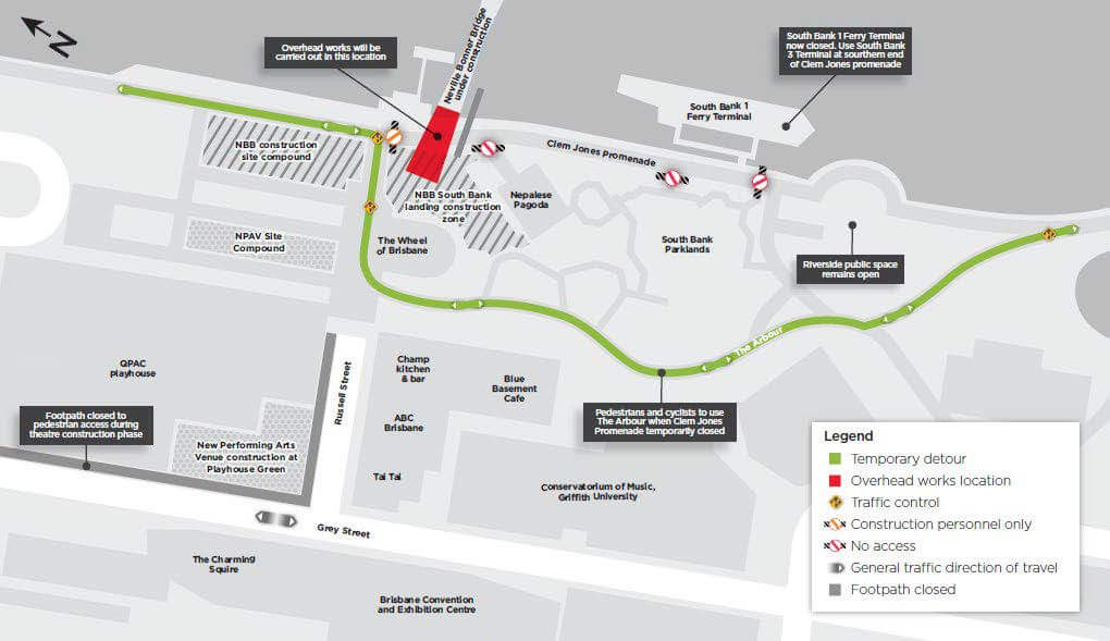 The Clem Jones Promenade will be closed between the Clem Jones Russell Street Ramp and the Riverside Open Space. Traffic controllers will be on-site to guide pedestrians and cyclists along the temporary detour. Cyclists will need to dismount and follow the detour route.