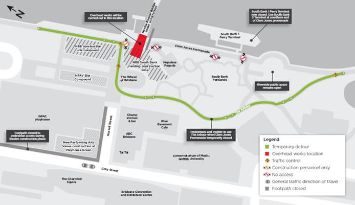 For safety reasons the Clem Jones Promenade in front of the site area will be closed while the overhead works are carried out. See attached map for details of the closed area and temporary detour.