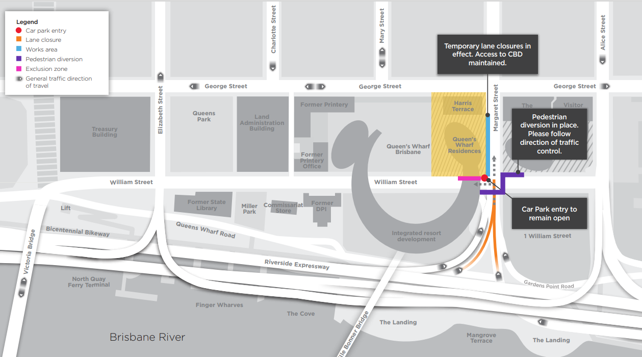 Motorists accessing the CBD can continue to use the Margaret Street southbound and northbound off-ramps and will be required to follow the direction of police and traffic control to access Queen’s Wharf and the CBD. Access will also be maintained to the Star Brisbane car park entry on Margaret Street.