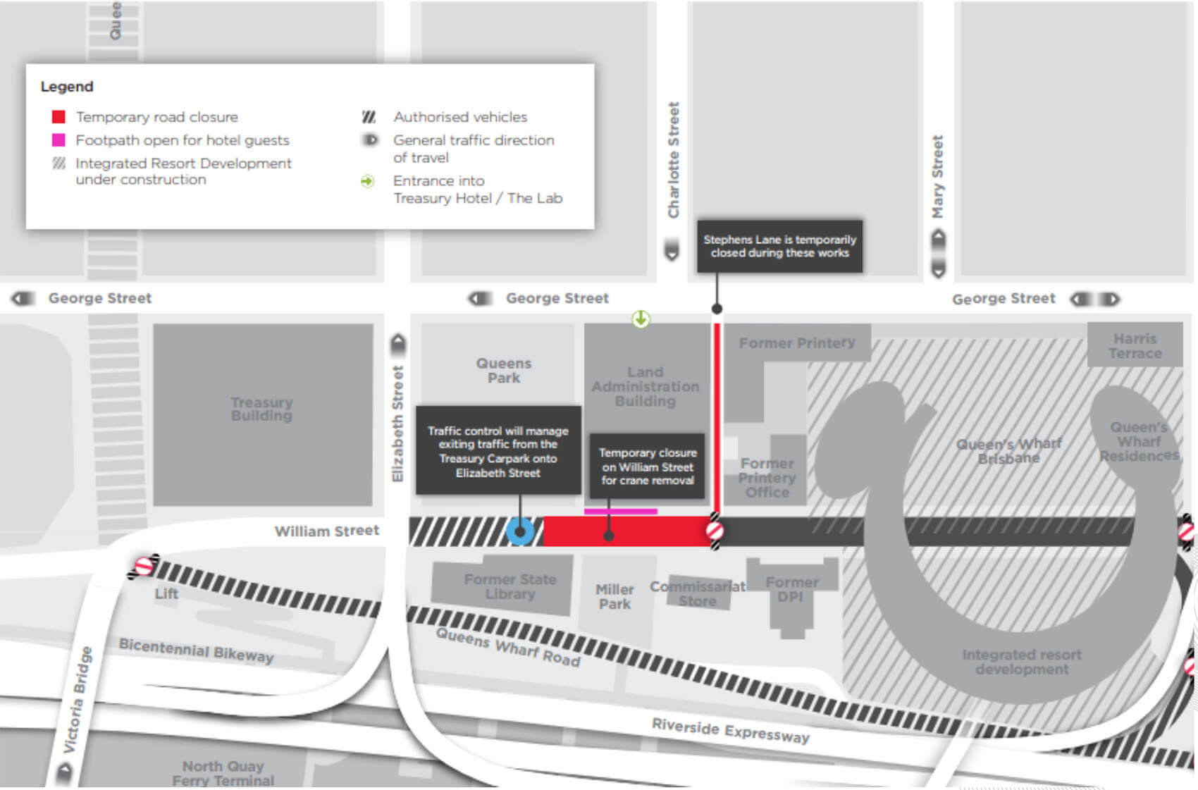 William Street – between the Queen’s Wharf development and Elizabeth Street will be temporarily closed for two days on Friday 26th April and Saturday 27th April 2024. Stephen’s Lane will also be closed during this time.