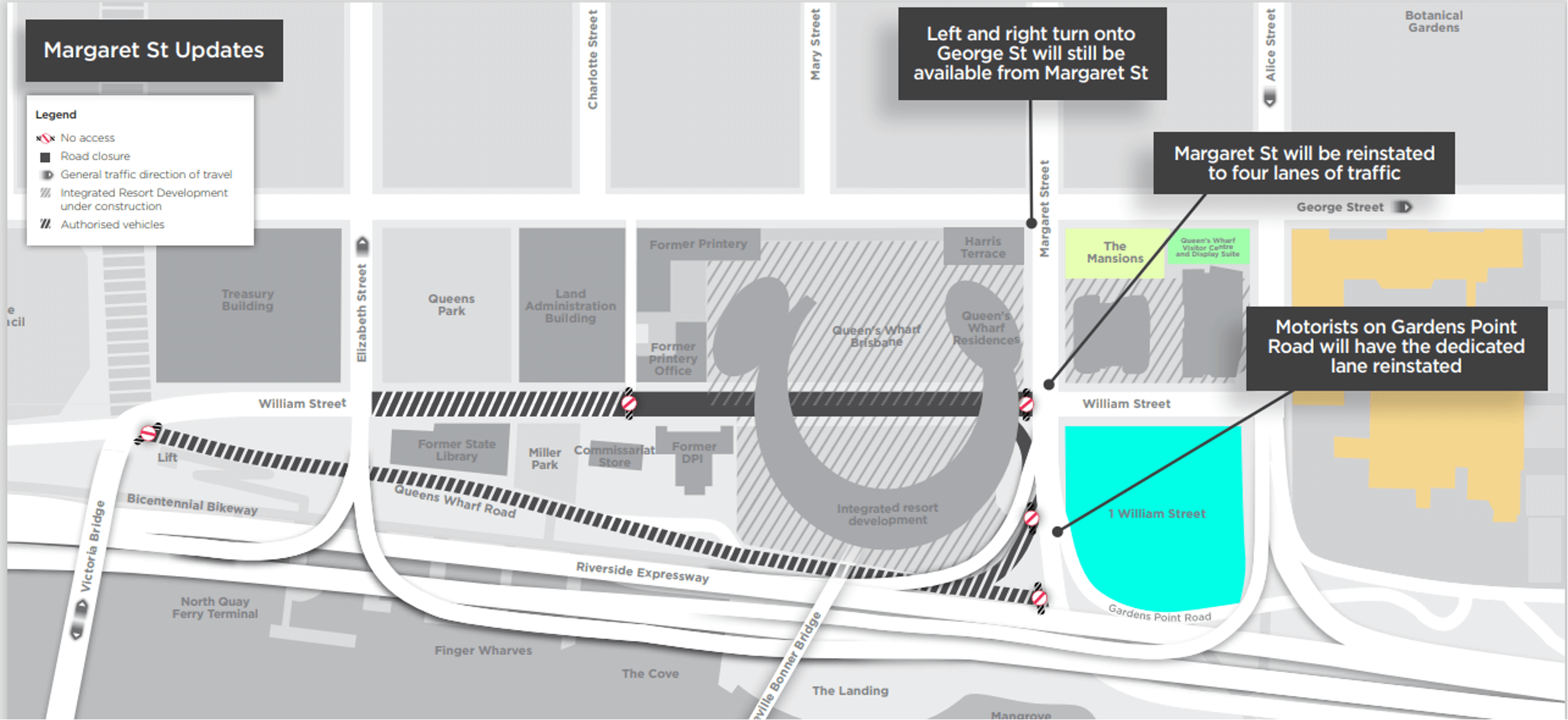 Road users on Gardens Point Road will no longer need to give way to vehicles exiting the Riverside Expressway off-ramps onto Margaret St. The dedicated lane from Gardens Point Road onto Margaret Street will be reinstated.
