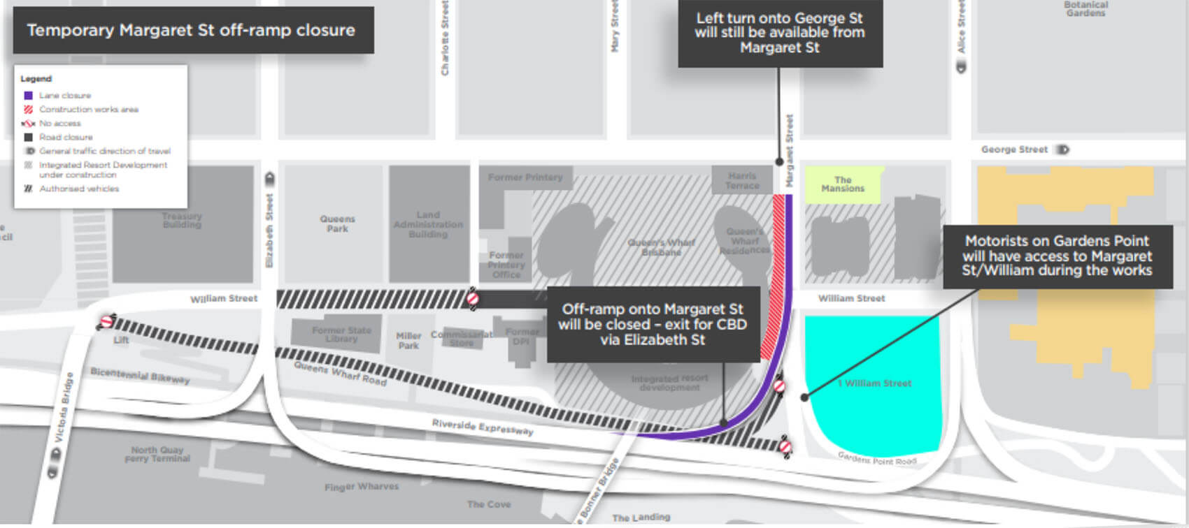 Southbound off-ramp onto Margaret Street will be closed as well as two lanes on Margaret Street while works are underway. Gardens Point Road access onto Margaret Street will be available at all times during the works.