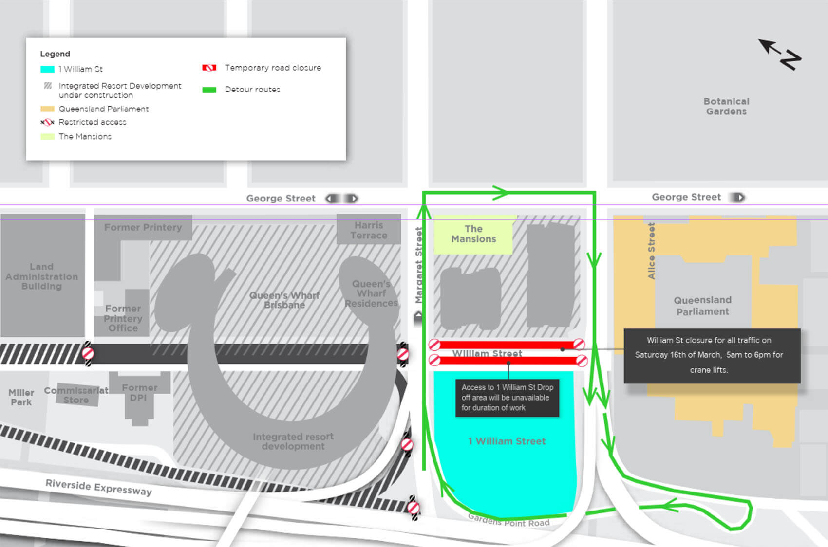 William St full closure between Margaret and Alice Sts. (see above map) Gardens Point Road access onto Margaret Street will remain at all times during the works.