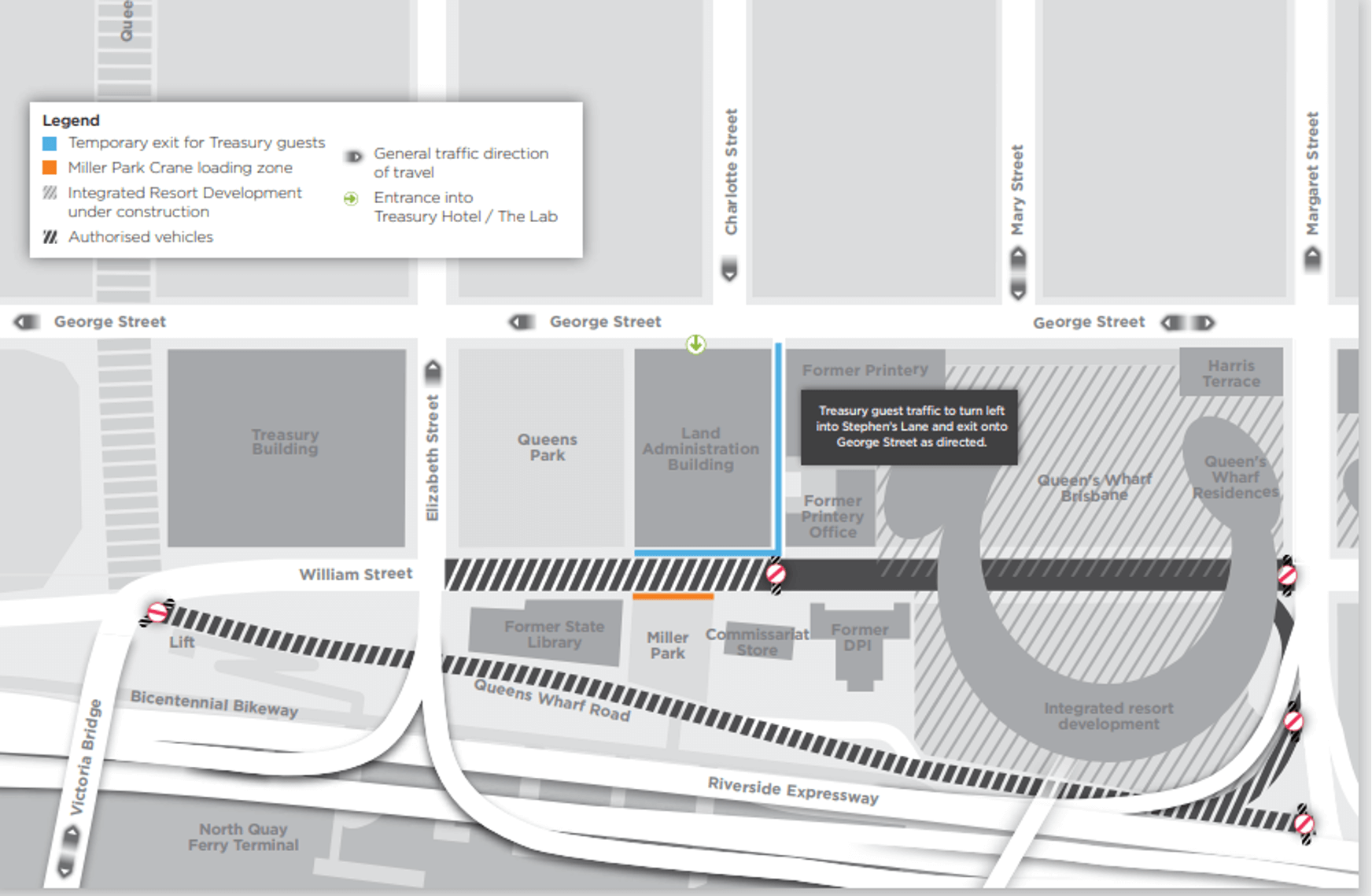 At times Treasury guests arriving at the concierge on William Street will be temporarily unable to complete a U-turn to exit but will be directed to exit via Stephens Lane onto George Street under the guidance of traffic control. This is to accommodate an exclusion zone for equipment and for a works area while the upgrades are underway.