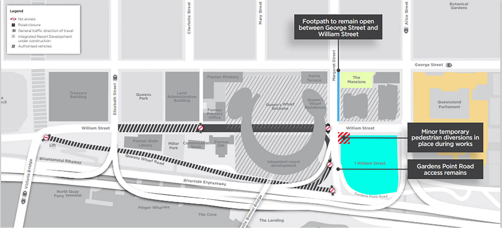 Access to the 1 William Street building will remain open and pedestrians are required to follow minor temporary diversions to accommodate the works.